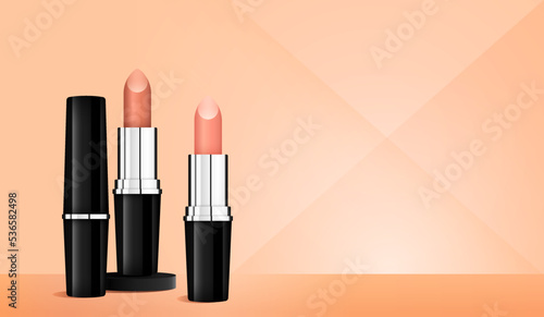 Obraz premium Vector realistic makeup sale banner design. Black Friday business promo flyer. Cosmetics luxury brochure. Premium lipstick poster. Cosmetology beige background. November holiday sales. Beauty ads