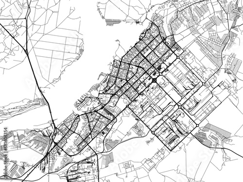 © Map Graphics, Naklejka premium Vector road map of the city of Naberezhnyye Chelny in the Russian Federation with black roads on a white background.