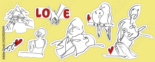 © olgahalizeva, Fototapeta premium Vector romantic illustration in one line art style with lovers, hearts and hands. Valentine's Day stilkers set. Different romantic objects.