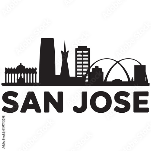 © firoz, Naklejka premium Vector San Jose skyline. Travel San Jose famous landmarks. Business and tourism concept for presentation, banner, web site. Vector black silhouette. with white background