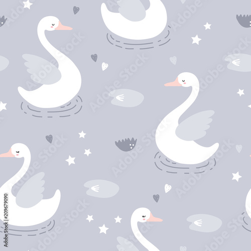 Obraz premium vector seamless background pattern with beautiful scandinavian swans for baby shower, fabric, textile