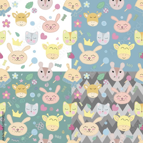 Obraz premium vector seamless pattern, cute animal faces on different background