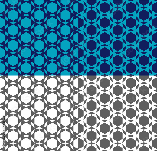 © VDNKL, Fototapeta premium Vector seamless pattern in arabic style. Ethnic ornament with triangle, hexagon. Geometric monochrome, blue background for wallpaper, textile print, backdrop, fabric. Color inversion. Simple shapes