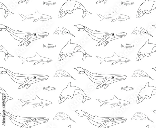 © Sweta, Fototapeta premium Vector seamless pattern of hand drawn doodle sketch fish whales and sharks isolated on white background