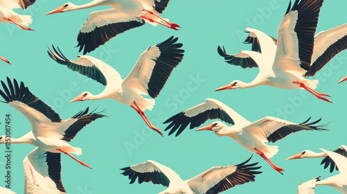© Nari, Fototapeta premium Vector seamless pattern of stork. The texture of the storks arranged in a random order