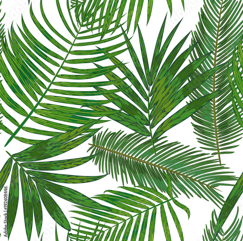 © OLEKSII, Obraz premium Vector Seamless pattern of tropical palm leaves. background of green areca, sago, howea foliage