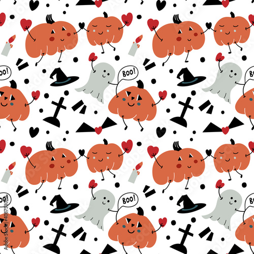 Fototapeta premium Vector seamless pattern on the theme of Halloween with cute pumpkins. In the style of hand drawing. Pumpkins, hearts, grave cross, hat, bat. For printing, for fabric, for wrapping.