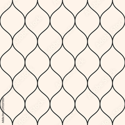© Olgastocker, Naklejka premium Vector seamless pattern, thin wavy lines. Texture of mesh, fishnet, lace, weaving, smooth grid. Subtle monochrome geometric background. Design element for prints, decor, fabric, furniture, web, covers