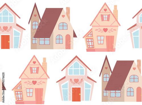 © veleri_kz, Fototapeta premium Vector seamless pattern with a cute country houses on white background. Texture with street with apartment with cute decorations front view