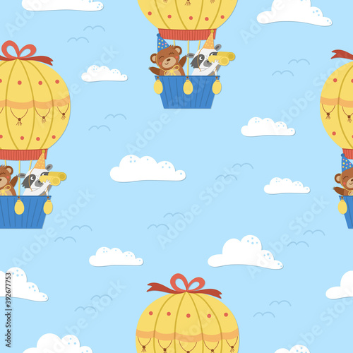 Fototapeta premium Vector seamless pattern with cute animals in hot air balloon and clouds. Holiday repeating background with adorable flying characters. Funny birthday digital paper for kids. .