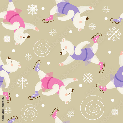 Fototapeta premium Vector seamless pattern with cute polar bears. Beautiful dancer on skates,...
