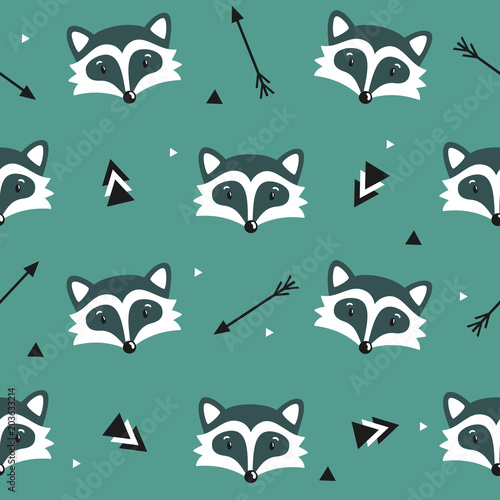Naklejka premium Vector seamless pattern with cute raccoons, arrows and triangles. Childhish...