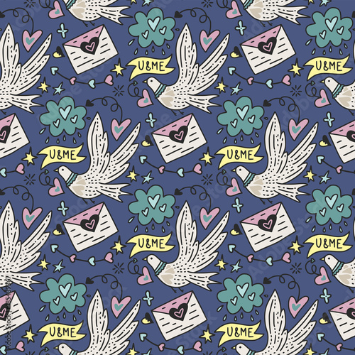 Fototapeta premium Vector seamless pattern with cute white doves, letters of love and hearts.