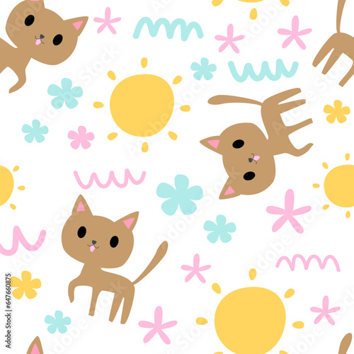 Obraz premium vector seamless pattern with hand drawn elements, sun and cat.