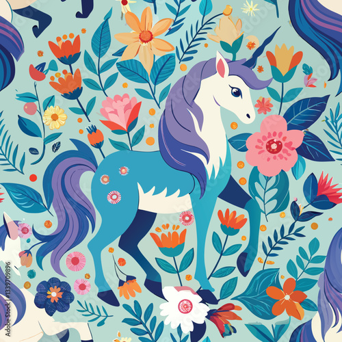© Shah Md prince, Obraz premium vector seamless pattern with hoarse and flowers