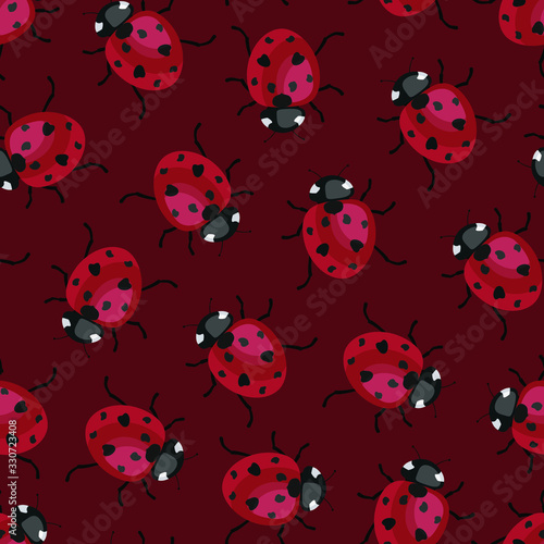 © Xaphana, Fototapeta premium Vector seamless pattern with ladybugs on red background; cute design for fabric, wallpaper, wrapping paper, textile, web design.
