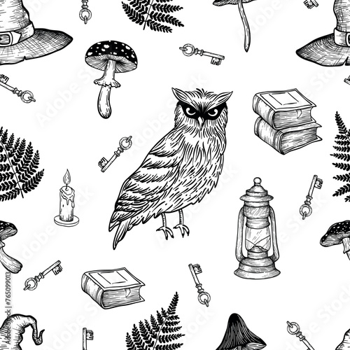 Naklejka premium Vector seamless pattern with magical elements such as hat, owl, books, mushrooms, fern, owl. Can be used to design packaging paper, textiles, etc.