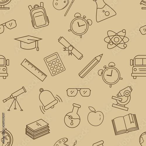 Obraz premium Vector Seamless Pattern with Outline School Icons on Brown Background