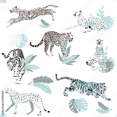 Naklejka premium Vector seamless pattern with predatory wild cats, tigers, leopards, cheetahs. For the design of postcards, fabrics and other