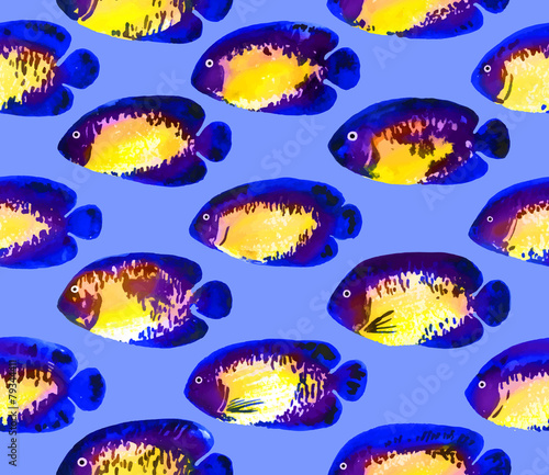© jet, Naklejka premium Vector seamless pattern with watercolor coral beauty angelfish