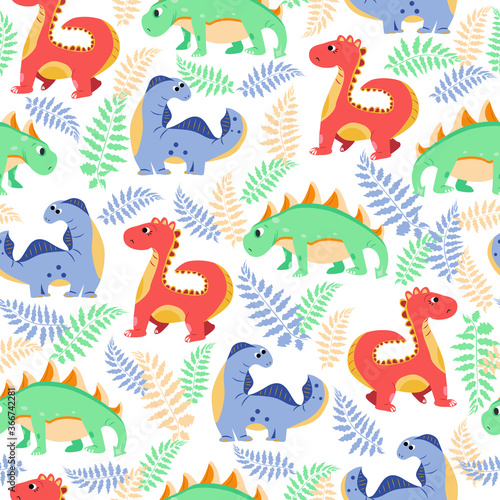 © Tatsiana, Fototapeta premium vector seamless patterns with dinosaurs and ferns. texture for children with cartoon motives and plants. patterns for decorating fabrics and children's clothing
