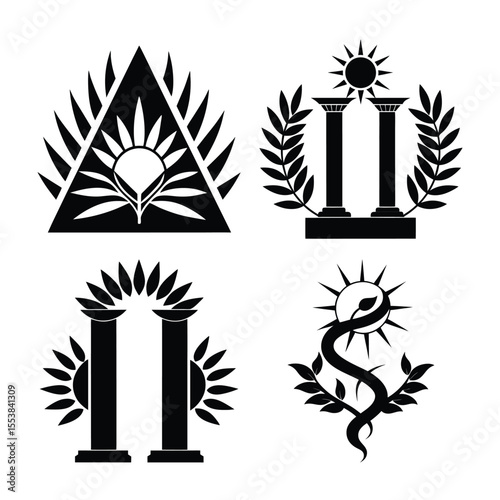 © vockto, Naklejka premium Vector set of ancient Greek symbols and column icons, featuring black silhouettes of sun, leaf, and tribal fire elements, perfect for tattoo design