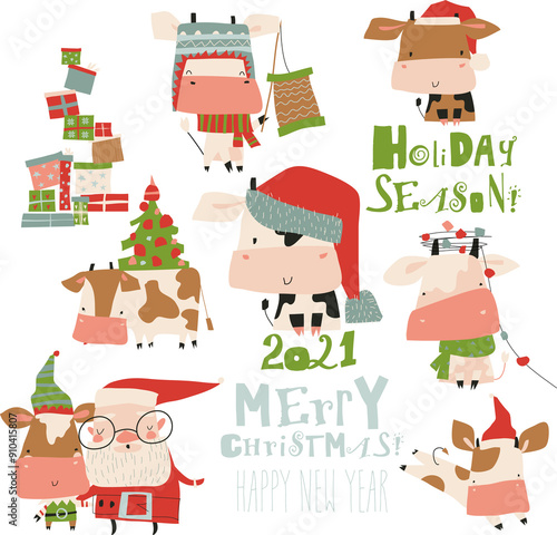 © Maria Starus, Fototapeta premium Vector set of bulls in costume and hat in different poses