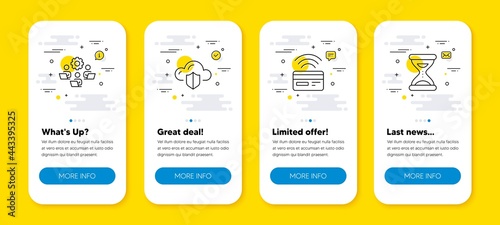 Fototapeta premium Vector set of Cloud protection, Contactless payment and Teamwork line icons set. UI phone app screens with line icons. Time icon. Storage security, Credit card, Remote work. Clock. Vector