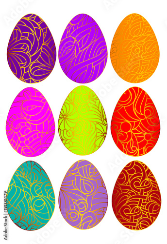 Fototapeta premium Vector set of color easter eggs with gold chic pattern isolated on a white...