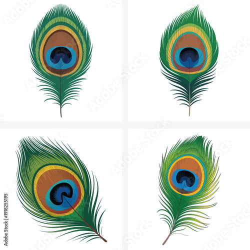 © NIKCHAN, Obraz premium Vector set of colorful peacock feathers with detailed eye patterns isolated on white background