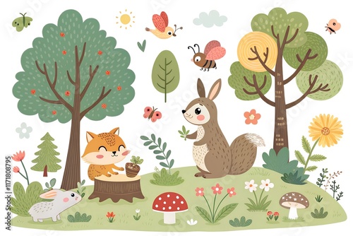 © DND, Fototapeta premium Vector set of cute forest elements - animals and trees