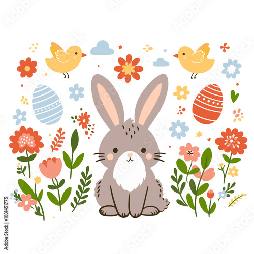Obraz premium Vector set of easter elements with bunny, flowers, eggs. Easter chicken on the lawn.
