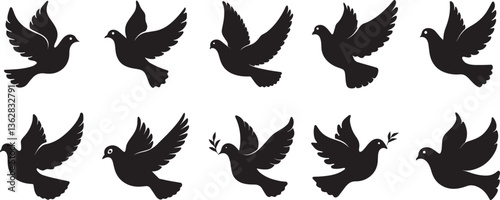 © Pujan, Obraz premium Vector set of fire flames with flying dove silhouettes