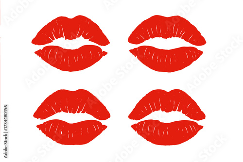 Obraz premium Vector set of red lipstick kiss marks. Collection of female mouth prints. Grunge texture lips imprint for romantic design, Valentine's day card, beauty and cosmetics concept.