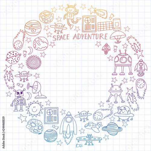 © Cepheia, Fototapeta premium Vector set of space elements icons in doodle style. Painted, colorful, gradient, on a sheet of checkered paper on a white background.