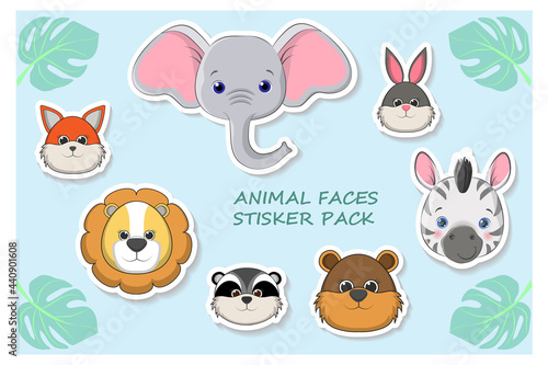 Naklejka premium Vector set with animals faces in cartoon style. Vector collection with mammals stickers. EPS 10.