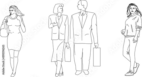 Fototapeta premium Vector silhouette illustration sketch, detailed design drawing of simple casual people carrying out work activities in formal clothes