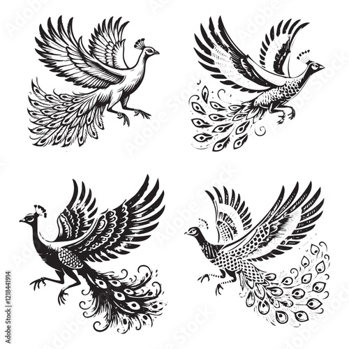 © Furqan, Obraz premium Vector Silhouette of a Flying Indian Peafowl Isolated on White Background"