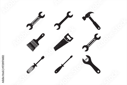 © Icon Nest, Fototapeta premium Vector silhouette tools icon set including hammer, wrench, screwdriver, saw, and paintbrush for construction and repair
