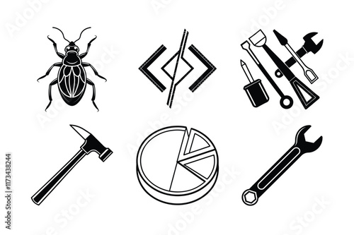 Fototapeta premium Vector Silhouettes of Bug, Code, Tools, Hammer, Pie Chart, and Wrench - Perfect for Microstock Platforms