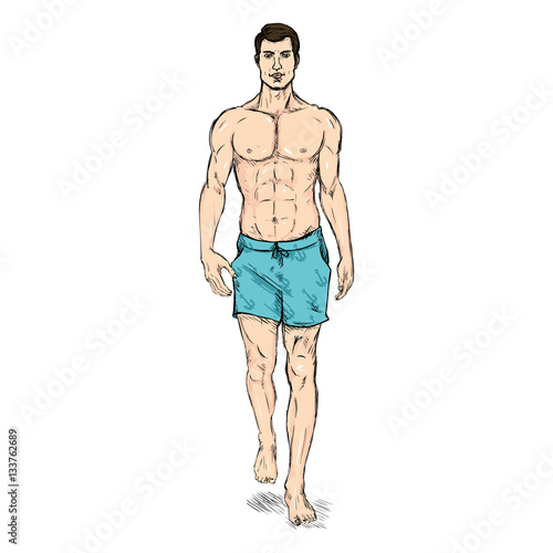 © nikiteev, Fototapeta premium Vector Sketch Fashion Male Model in Blue Beach Shorts