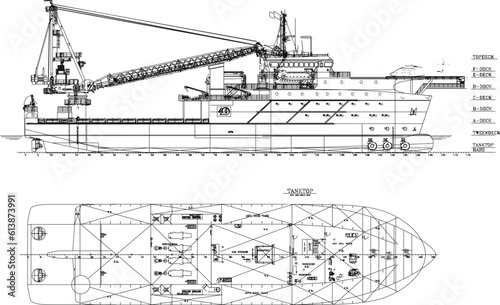 © TSANI, Obraz premium Vector sketch illustration of a rescue ship at sea with detailed goods interior