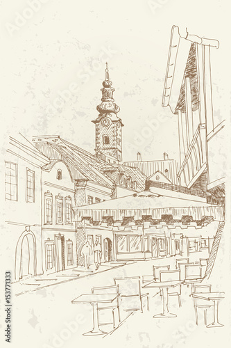 © phant, Fototapeta premium vector sketch of Tkalciceva street scene in Zagreb, Croatia. Retro style.