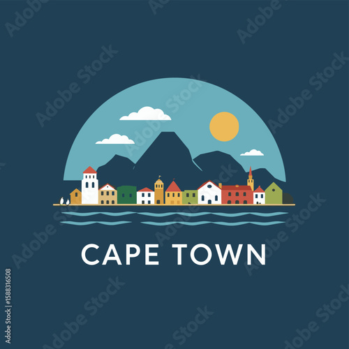 © Alghas, Naklejka premium Vector skyline of Cape Town with colorful houses, ocean, Table Mountain and sun. South African cityscape in flat design