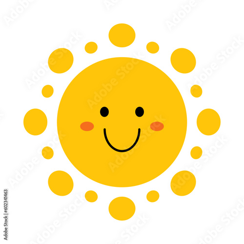 © Ulyana Mo, Fototapeta premium Vector smiling sun in flat design. Funny sun with face. Childish cute sunshine emoji. Simple kawaii sun with round sunbeams. Baby sunshine with blush.