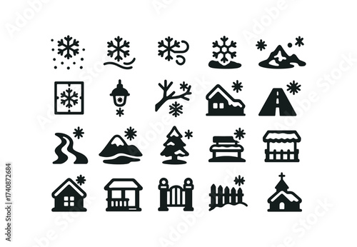 © Lera, Fototapeta premium vector solid black filled icons Snowflakes (Scenes) snow, falling, flake, drifting, swirling, piling, melting, freezing, window, frost, lamp, branch, roof, road.
