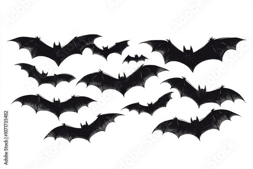 © JIALU, Naklejka premium Vector sticker of black bats flying in silhouette against solid white background.