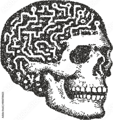 Fototapeta premium Vector stipple drawing of cybernetic skull with circuit board brain and...