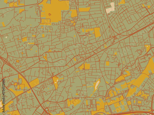 Obraz premium Vector-style flat map of Pessac, France with sage green ground with rust-red roads and ochre accents.