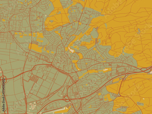 Obraz premium Vector-style flat map of Sindelfingen, Germany with sage green ground with rust-red roads and ochre accents.